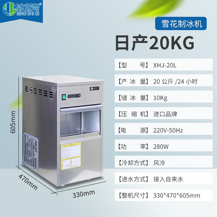 产品描述:冰世奇20公斤雪花制冰机日产量20kg,适用于实验室、学校、医院、科研单位等,冰型为不规则大小颗粒状,降温保鲜效果好。...